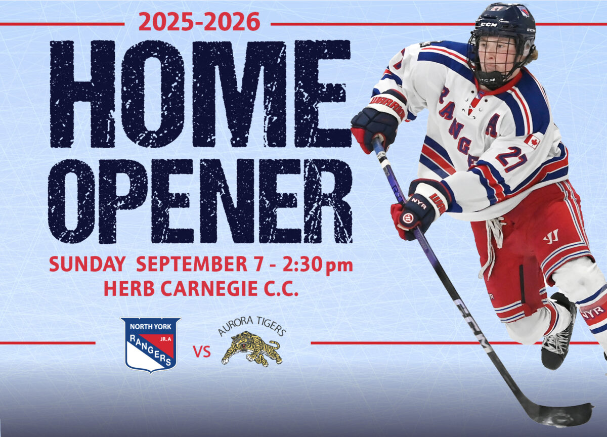 Hockey is back! The NYRJRA Rangers open the 2025-26 season against the Aurora Tigers on Sunday, September 7th at 2:30 PM at the Herb Carnegie Community Centre.